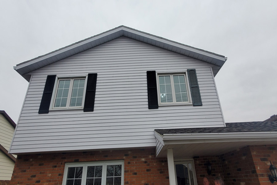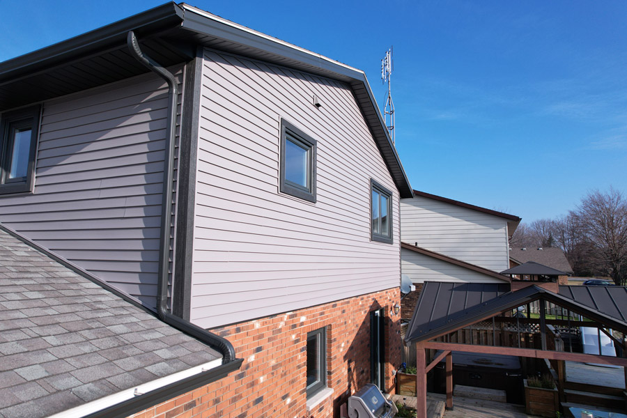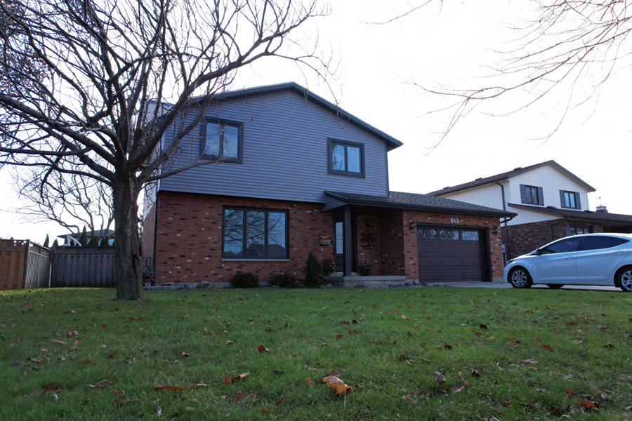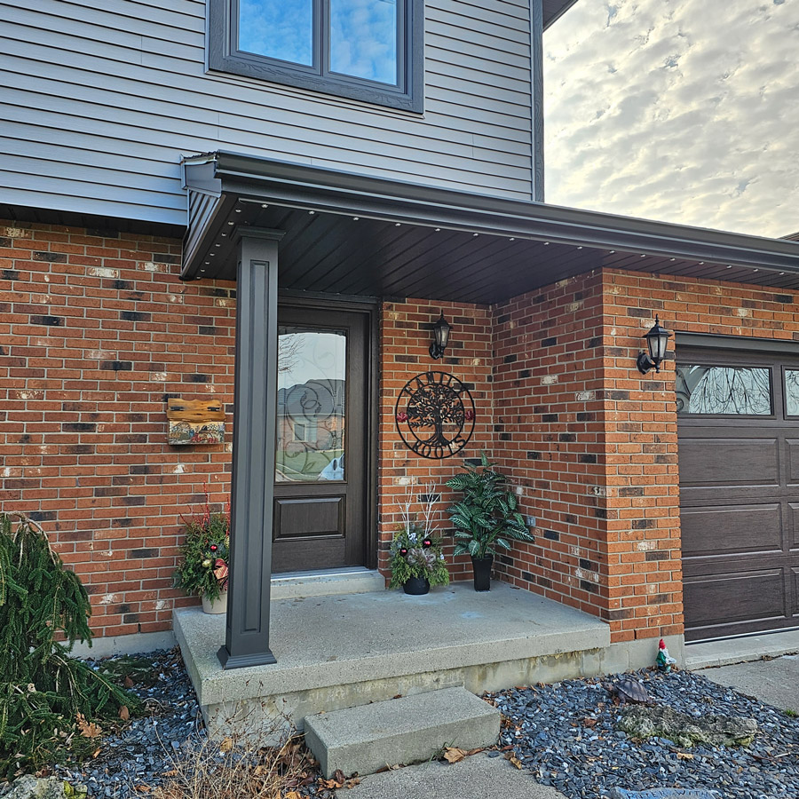 5 June 2024 Side-Split Full Exterior Renovation Project Information: Location: Chatham, Ontario Materials Breakdown: Vinyl Siding: StonecrestSoffit/Fascia/Eaves: Aluminum Rustic GraniteTrims: Engineered Wood Grey RusticEntry Door: Mahogany Wood Grain Fibregalss with A Brella Fusion GlassPost Wraps: Piranha Recessed Panel in EspressoSoffit Lighting: Gemstone Track LightingSliding Glass Patio Door: Rustic Granite BeforeAfter