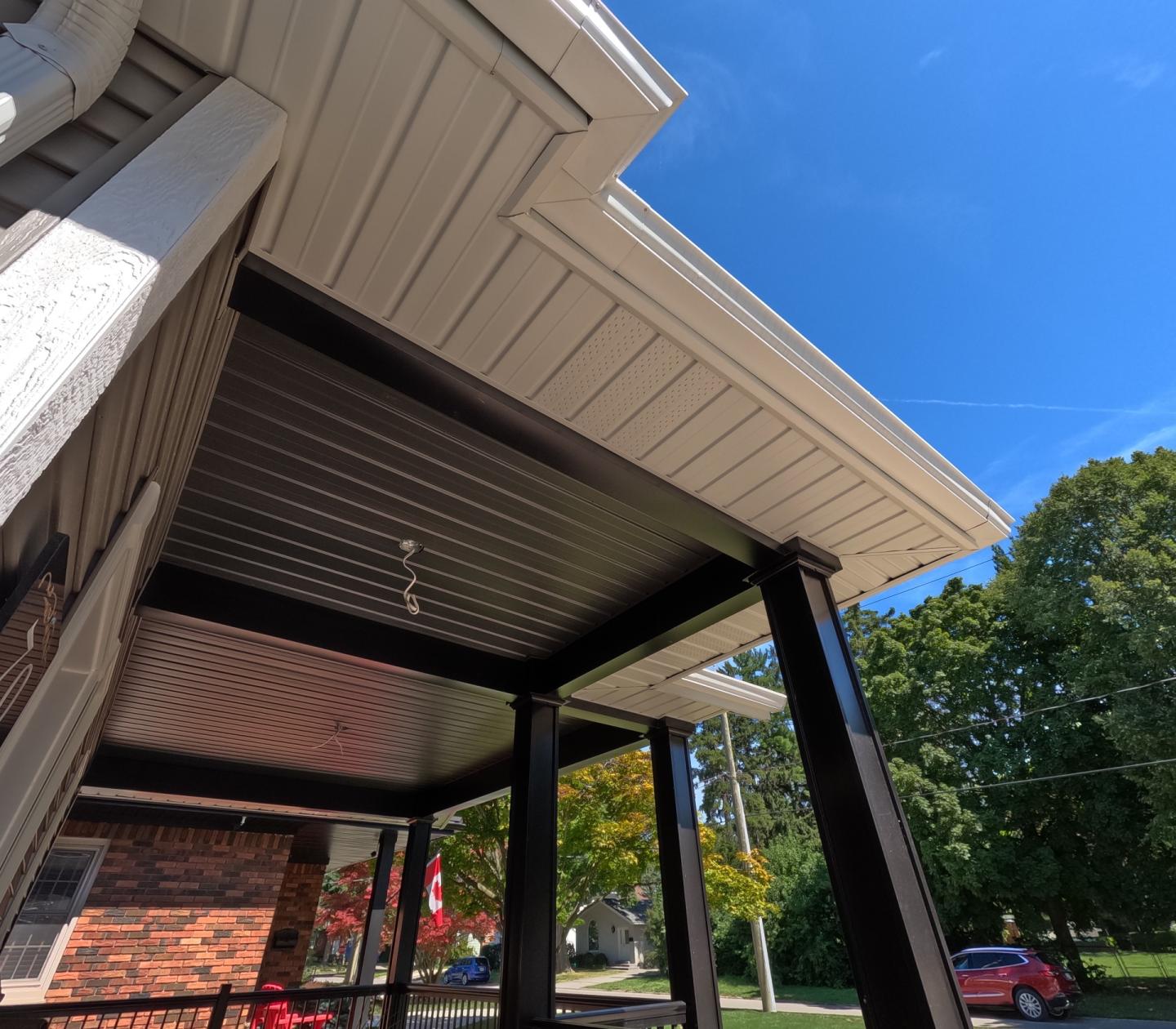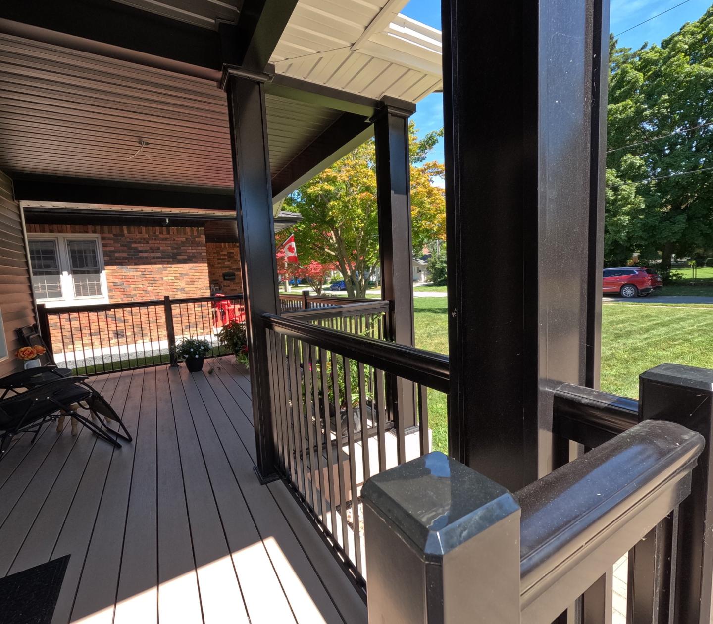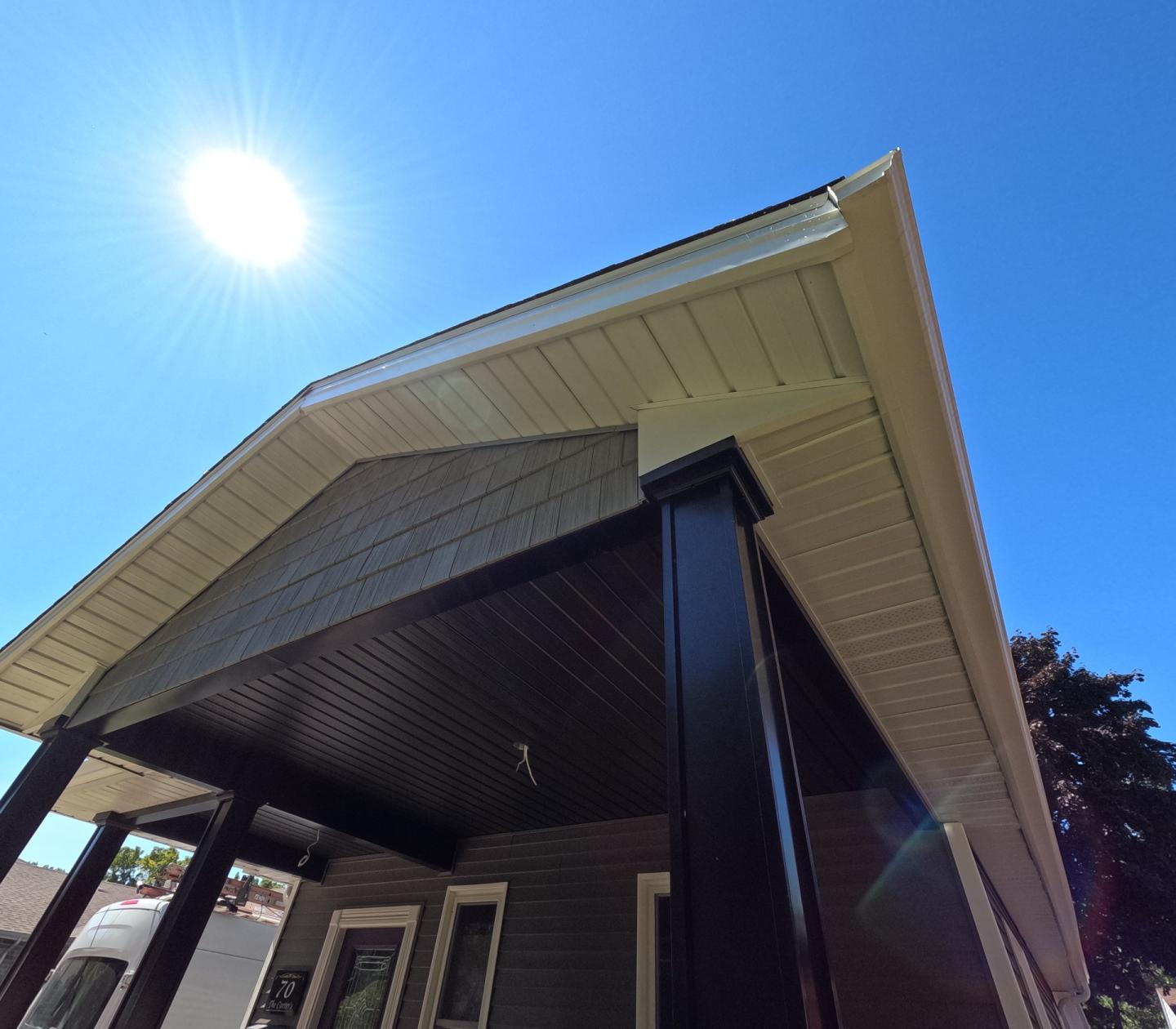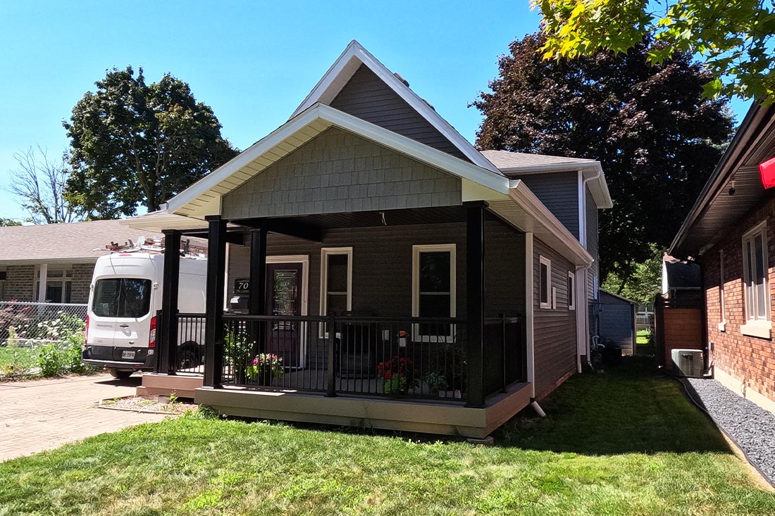20 August 2024 Covered Porch Addition & Reno Project Information: Location: Chatham, OntarioRenovation Type: Covered Porch Addition & Full Exterior Reface Materials Breakdown: Vinyl Siding: ManorVinyl Shake: DuskSoffit/Fascia/Eaves: Aluminum Rustic GraniteTrims: Engineered Wood WhitePost Wraps: Aluminum BlackRailings: Powder Coated Aluminum, BlackSoffit/Fascia/Eaves: Aluminum Black/Wolfe WhiteComposite: Clubhouse Cobblestone BeforeAfter