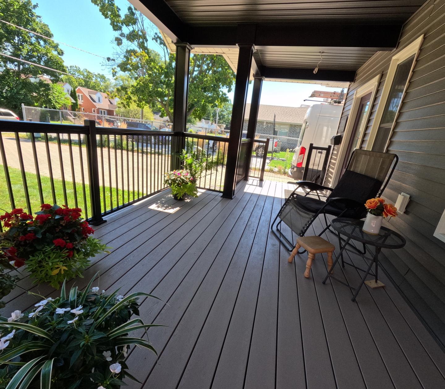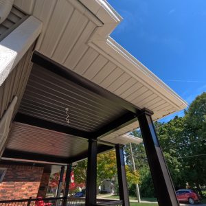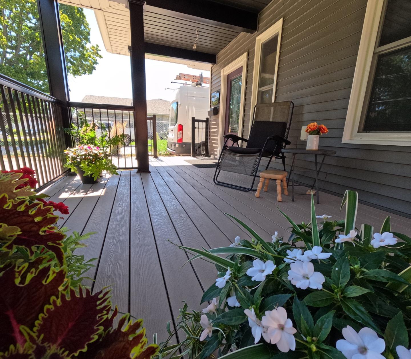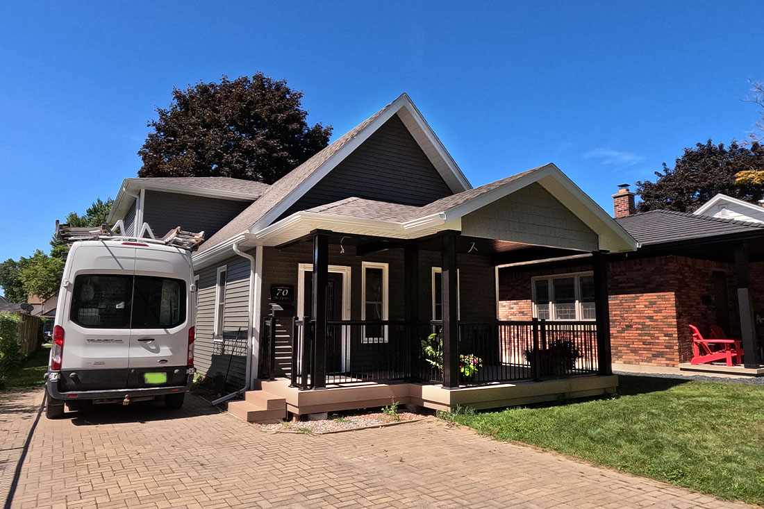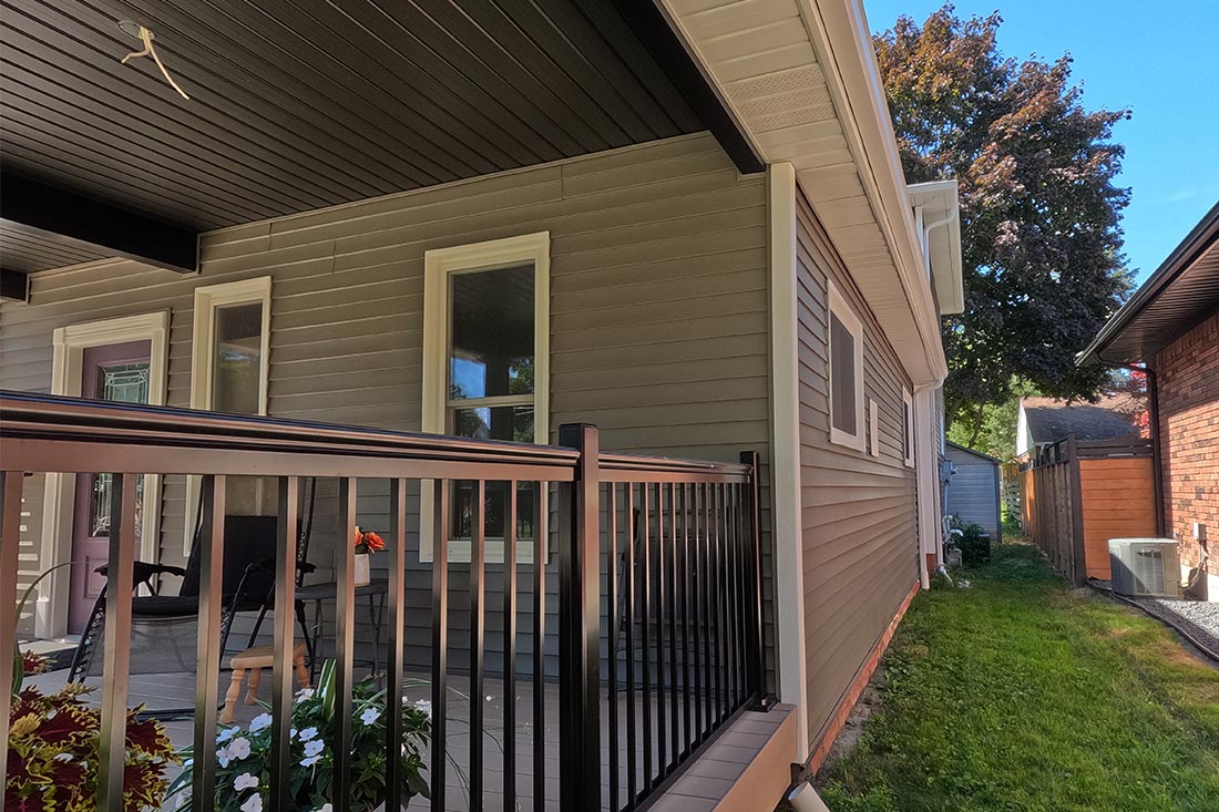20 August 2024 Covered Porch Addition & Reno Project Information: Location: Chatham, OntarioRenovation Type: Covered Porch Addition & Full Exterior Reface Materials Breakdown: Vinyl Siding: ManorVinyl Shake: DuskSoffit/Fascia/Eaves: Aluminum Rustic GraniteTrims: Engineered Wood WhitePost Wraps: Aluminum BlackRailings: Powder Coated Aluminum, BlackSoffit/Fascia/Eaves: Aluminum Black/Wolfe WhiteComposite: Clubhouse Cobblestone BeforeAfter