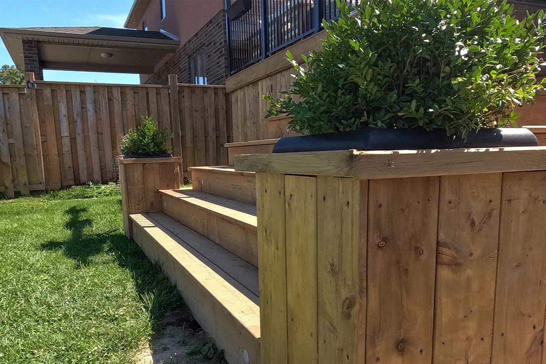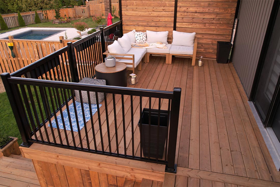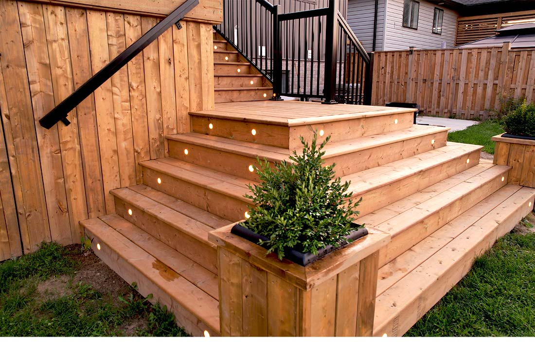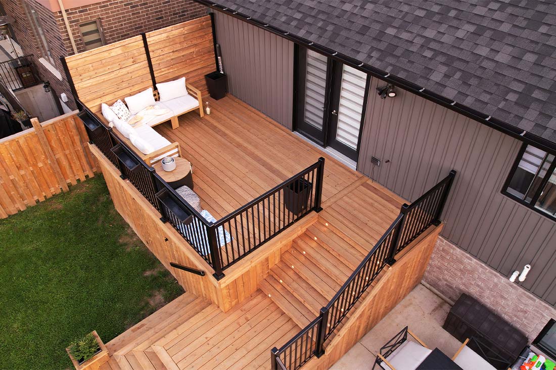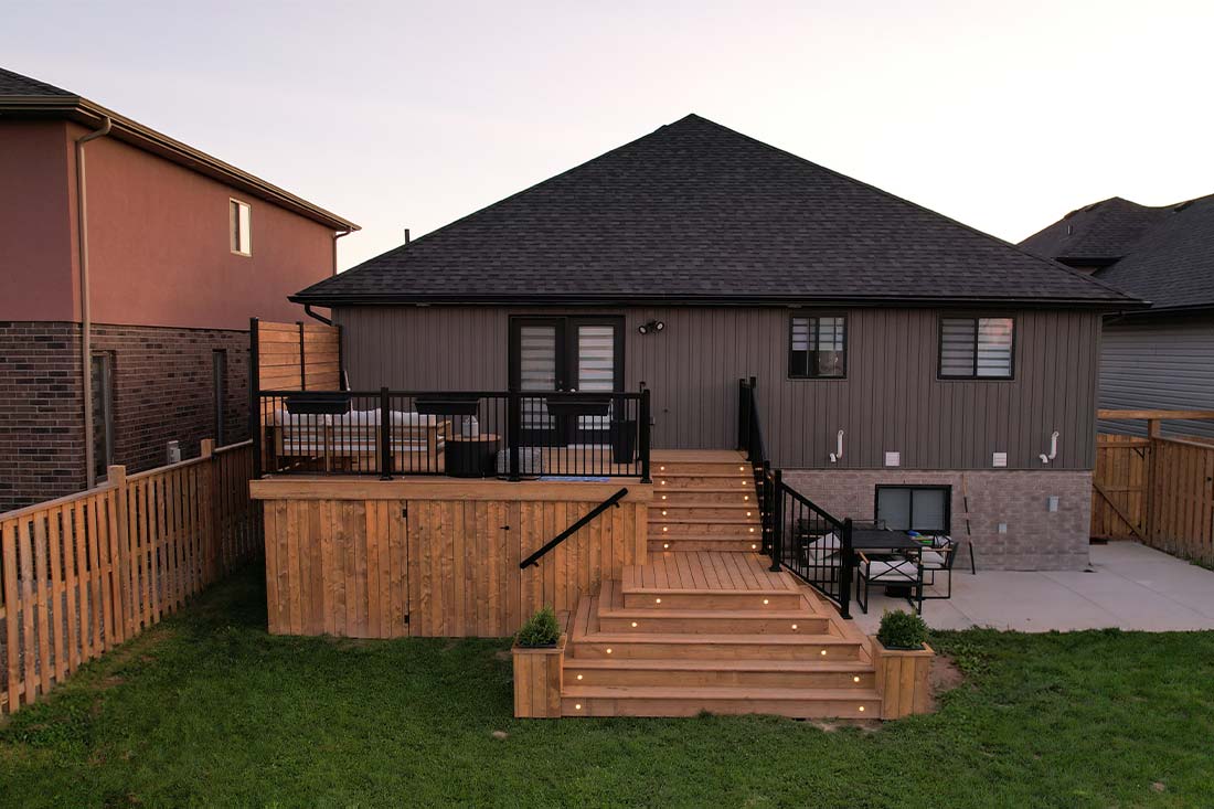 22 October 2024 Custom Multi-tier Deck Project Project Information: Location: Chatham, OntarioRenovation Type: Deck Construction Materials Breakdown: Deck Boards: Pressure Treated WoodRailings: Black Powder Coated AluminumDeck Lights: Gemstone Lights